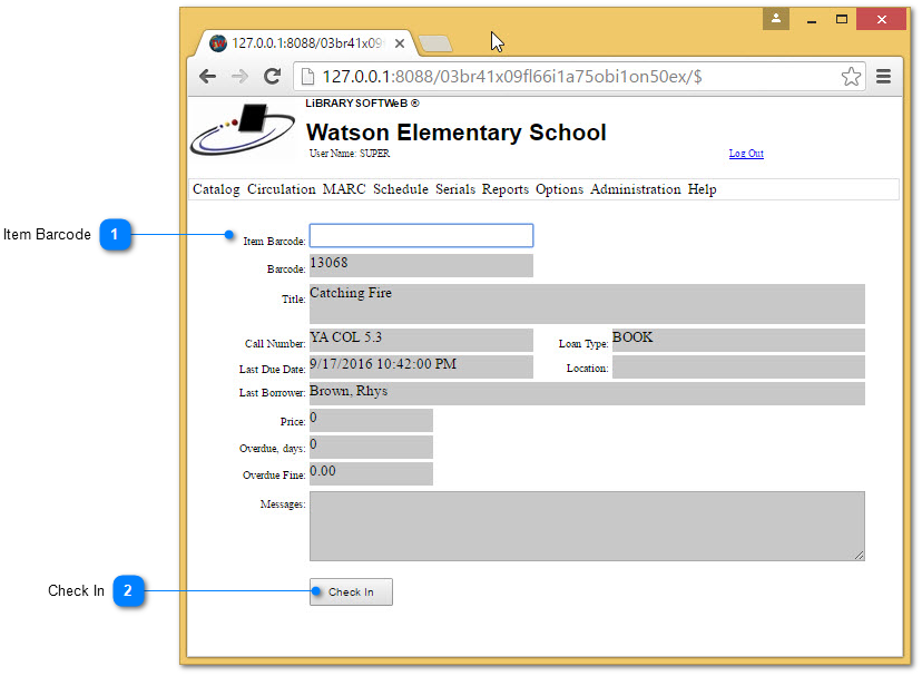 If you Typed in the Barcode of the Item you will need to click the Check In Button.