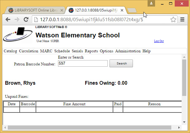 The Patron Barcode must be entered in order to bring up the Fines Screen.