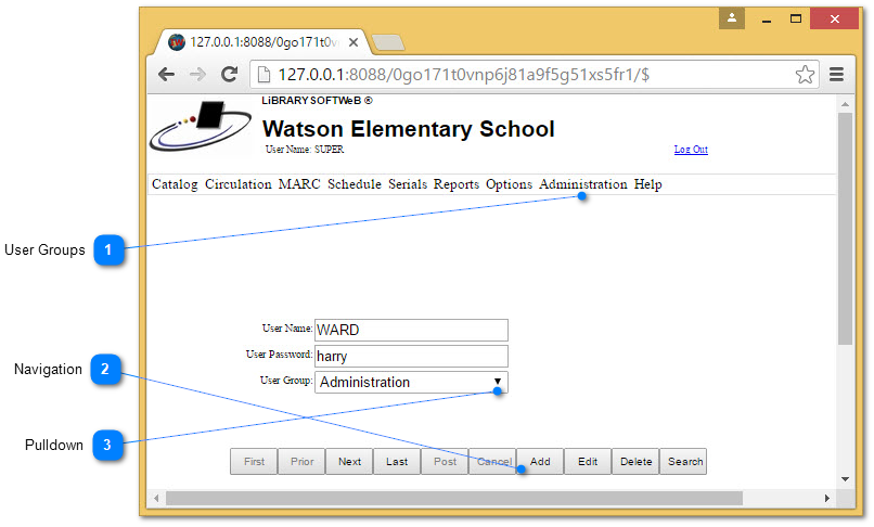 Default Security settings are in place.An Administrative level Username and Password will be provided with your LiBRARYSOFTWeB purchase.