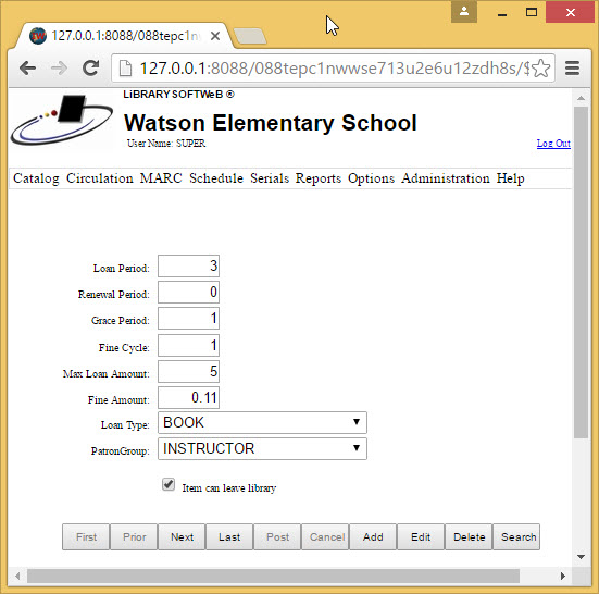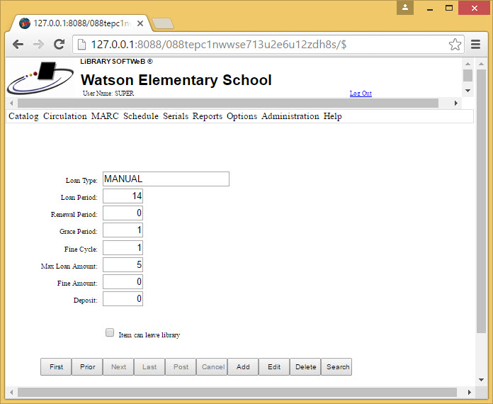 Loan Types define the borrowing periods for an item. Defaults are set up for most items. You can edit and add more Loan Types.