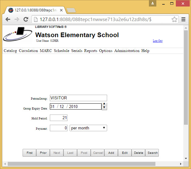 2.Select a Patron Group by clicking on an item at the left of the screen. If the Group does not exist click Add to add the Patron Group.